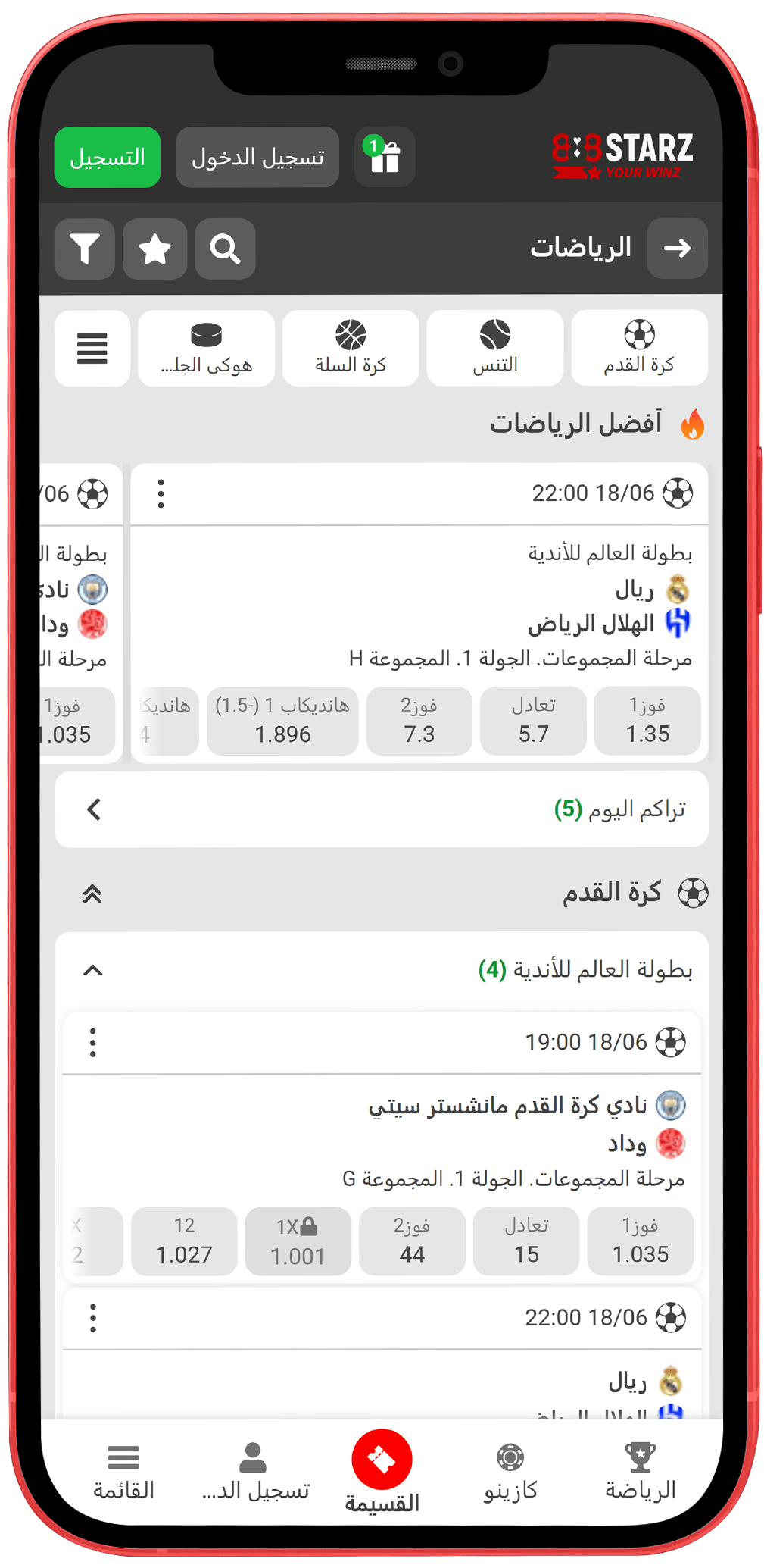 المراهنة على الألعاب الرياضية داخل التطبيق، يمكنك تصفح أكثر من 80 فئة رياضية والمراهنة على الأحداث المحلية والعالمية. يتم تضمين الاحتمالات المباشرة وإحصائيات ما قبل المباراة. من الممكن إضافة اختيارات متعددة إلى قسيمة رهان واحدة. -