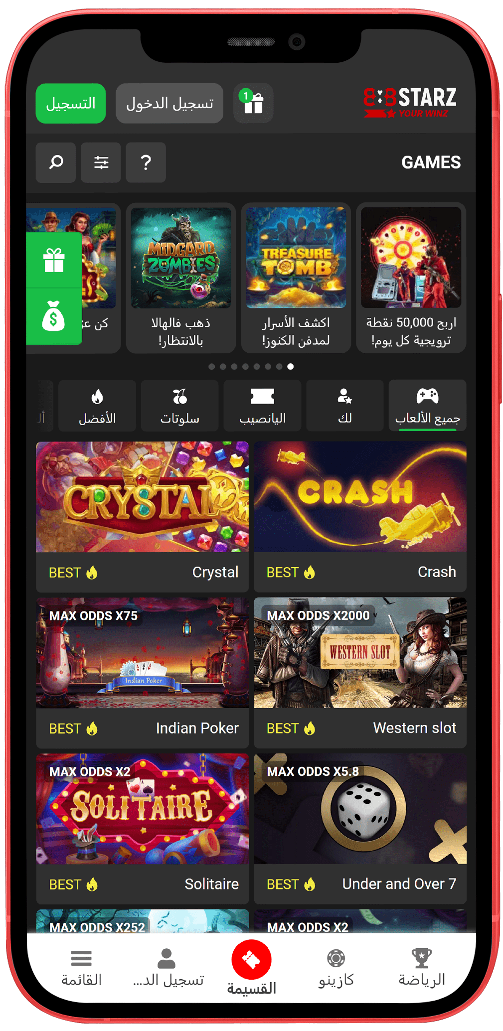 ألعاب الكازينو تمنحك تطبيقات 88starz iOS و أندرويد إمكانية الوصول إلى ماكينات السلوتس وألعاب التحطيم وألعاب الطاولة وخيارات الكازينو المباشر. الفلاتر حسب الفئة والمزود مدعومة. قم بالتبديل بين المال الحقيقي والعروض التجريبية على الفور. -